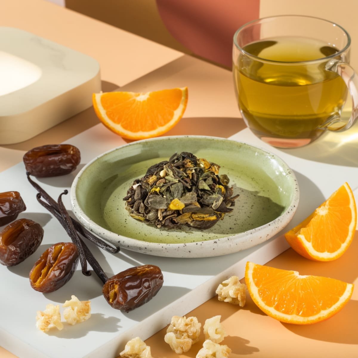 Morceaux de datte, morceaux de pomme, thé vert (14%), thé blanc (13%), morceaux de caramel vegan (10%) (sucre de canne, sirop de glucose, beurre de cacao, lait de coco en poudre (lait de coco en poudre, maltodextrine, fibre d’acacia), protéine de pois, dextrose, sel, arôme naturel de vanille, émulsifiant : lécithine de tournesol), thé noir, quartiers d’orange, riz complet soufflé, zestes d’argousier, arôme naturel d’orange, arôme naturel de vanille, arôme naturel de mandarine.